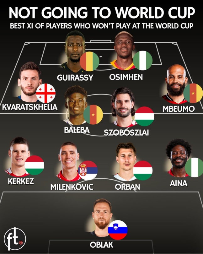 2026 북중미 월드컵에 참가하지 못하는 선수들로 구성된 베스트 11이 발표됐다. 이 명단에는 세계적인 골키퍼 얀 오블락과 헝가리의 밀로시 케르케즈, 세르비아의 밀렌코비치 등이 포함되어 있다. 이들은 각국의 대표팀에서 뛰지 못하는 아쉬운 상황에 처해 있으며, 앞으로 더 많은 선수들이 이 리스트에 추가될 가능성이 있다.